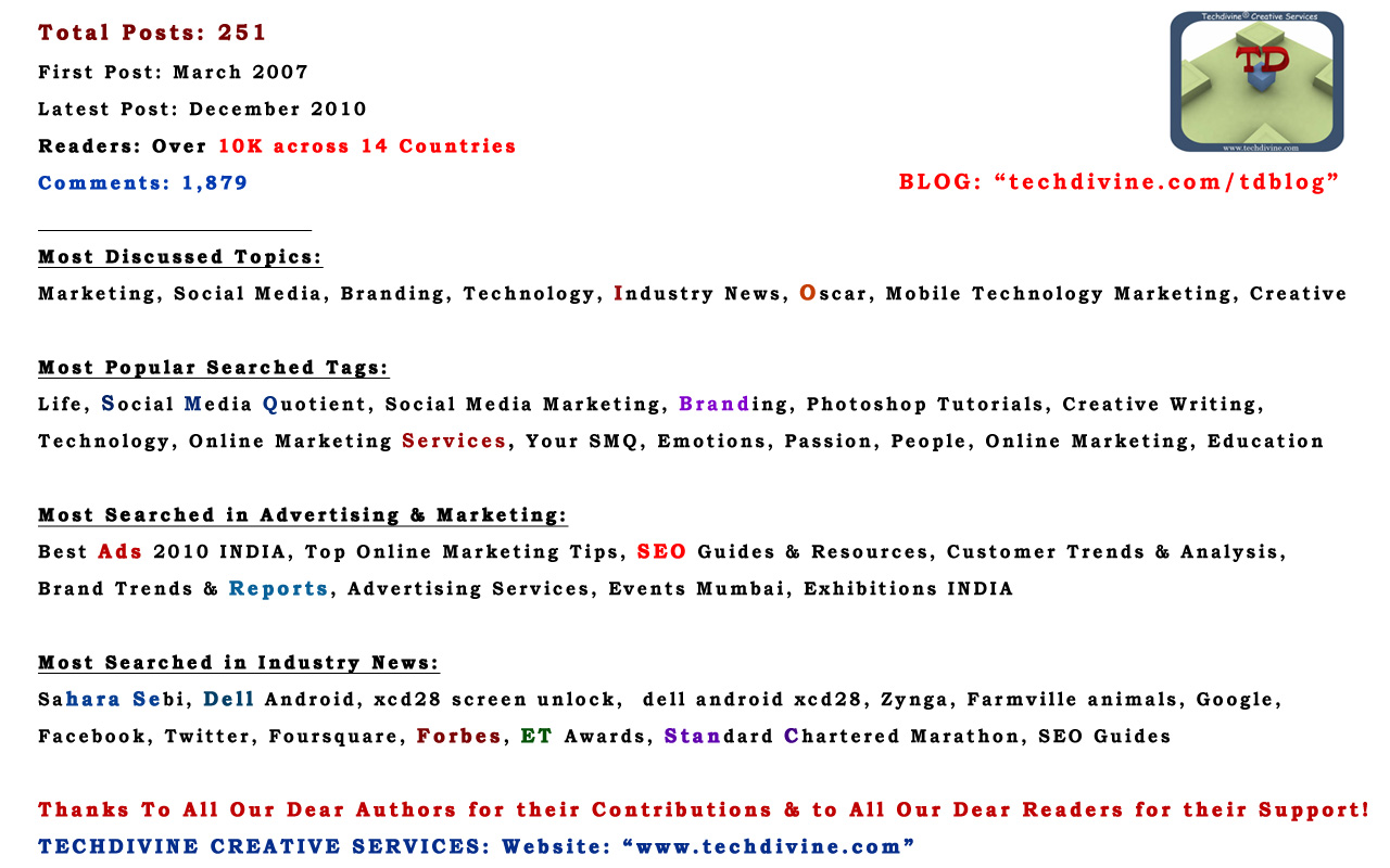 We at Techdivine Creative Services would like to Thank All Our Dear Authors & Readers for making this Blog a Corporate Success and a powerful medium for Brands, Products & Services to reach across globally.