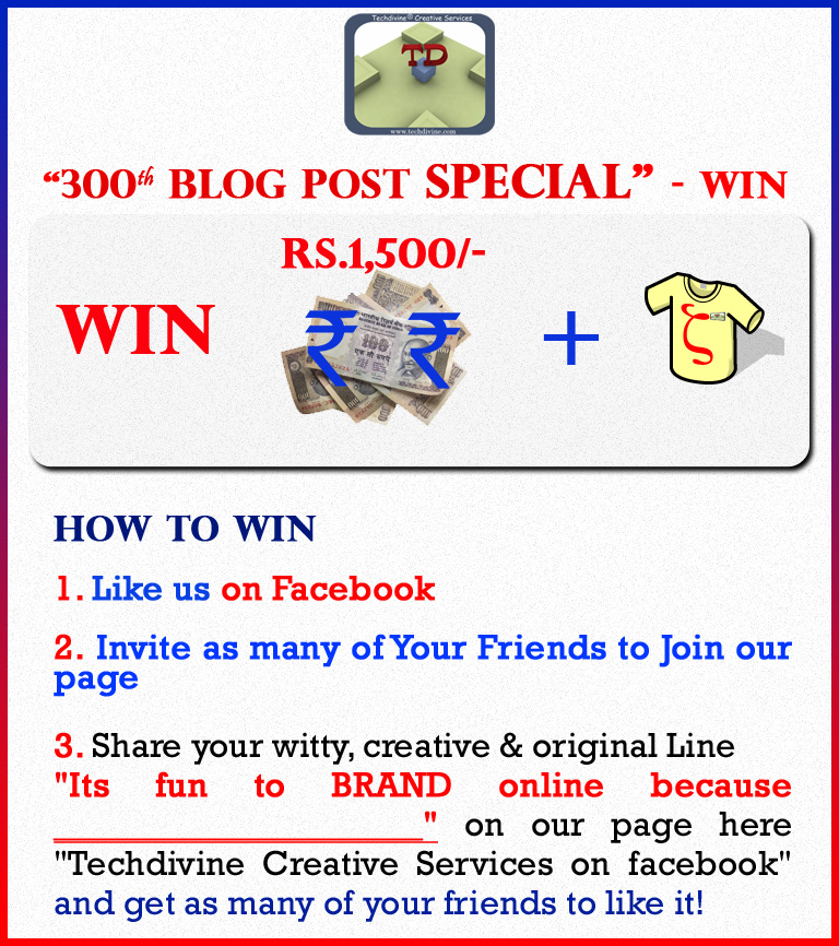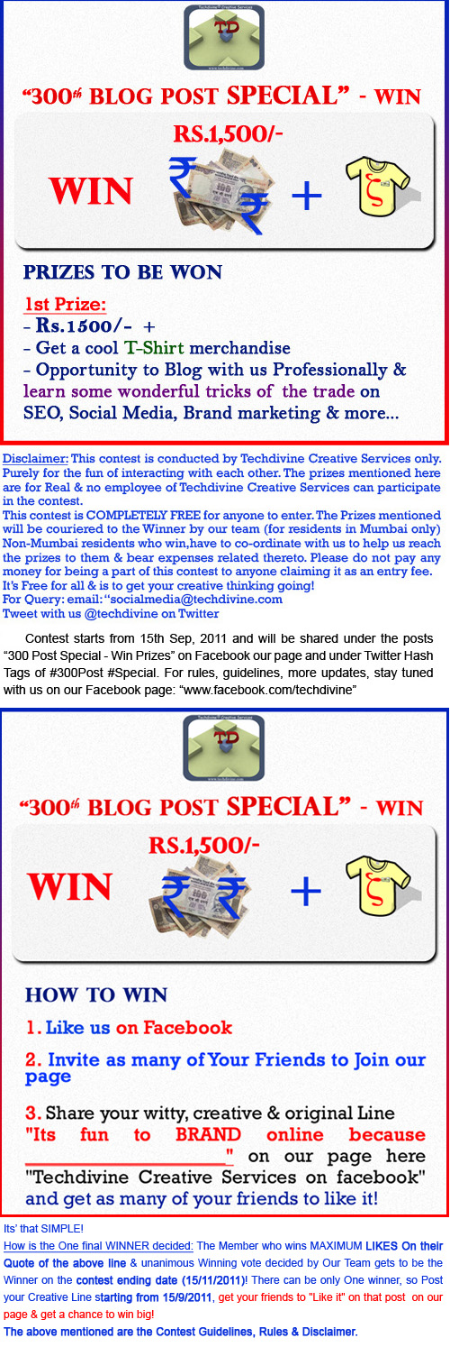 3. Share your witty, creative & original Line “Its fun to BRAND online because ____________________” on our page here “Techdivine Creative Services on facebook” and get as many of your friends to like it! The Member who wins MAXIMUM LIKES On their Quote of the above line & unanimous Winning vote decided by Our Team gets to be the Winner on the contest ending date (15/11/2011)! There can be only One winner, so Post your Creative Line starting from 15/9/2011, get your friends to “Like it” on that post & get a chance to win big!