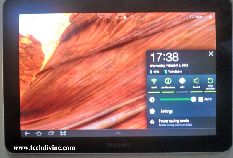 Ease Of Use: The Galaxy Tab ships with Android 3.1 (Upgradable to 3.2 via Samsung Kies). Samsung has glossed it over with their Proprietary UI called TouchWiz. This makes even more spunky and easier to navigate. Case in point, the notification bar at the bottom right gives you quick access to toggles for connectivity, orientation, brightness, settings, clock and the calendar. The icon dock at the bottom is visible wherever you are, so you never get confused and can easily return to the home screen in a jiffy. The volume keys and the power button are placed ergonomically at the top facilitating quick access.