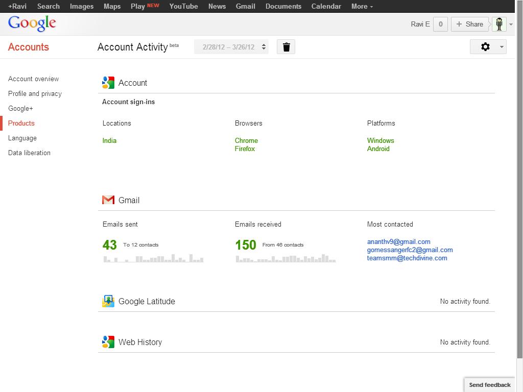 Google has just launched a new feature called Account Activity which gives you a summarized report of your usage of various Google services. This includes a count of the number of emails you have sent or received, The locations you have signed in from along with the ISP used, the various browsers and platforms used and your web history to name a few.