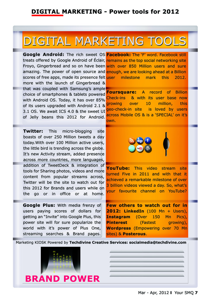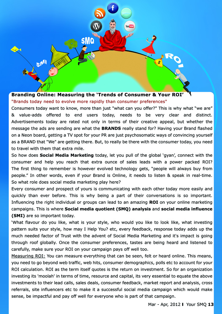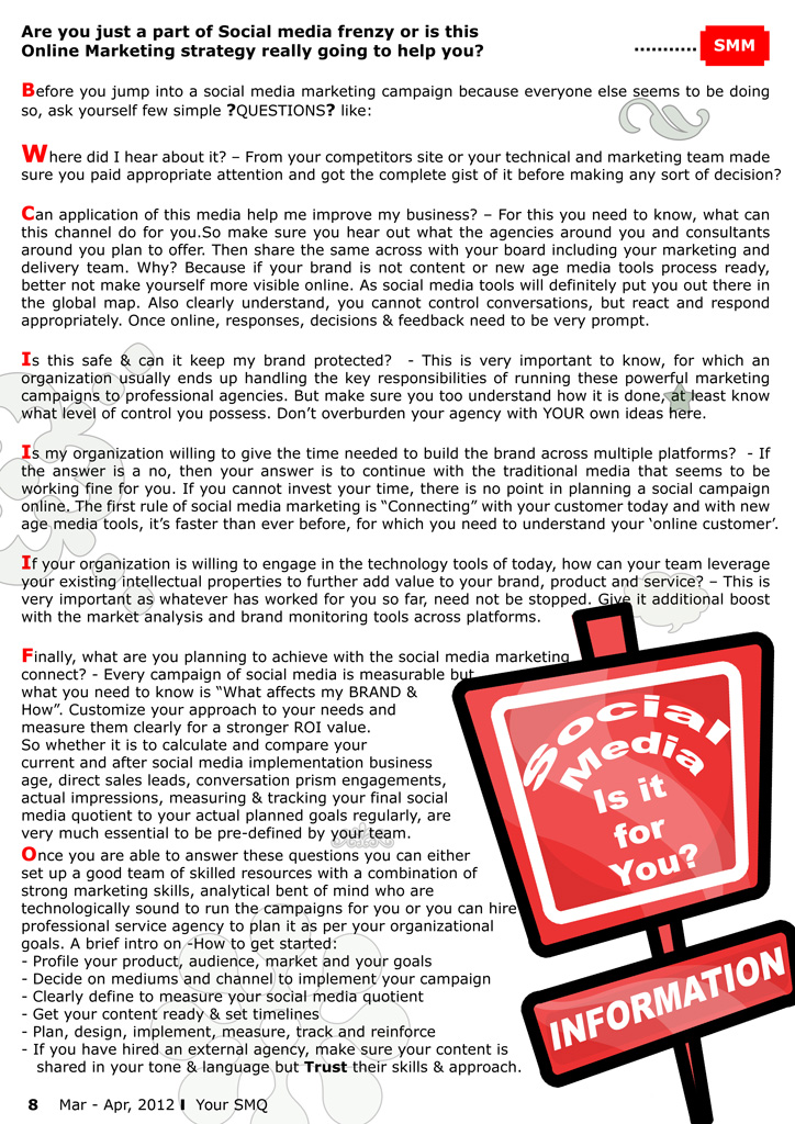The SMQ – Social Media Quotient magazine is available in Print magazine (Not for Sale) and is shared with our premium members only. We will be publishing soft copies of the pages online eventually. Given below are few of the Your SMQ Pages of “Mar-Apr,2012”