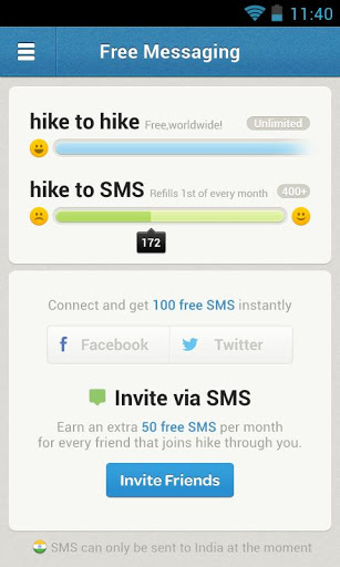 While there are a ton of messengers out there, what makes Hike so different from the rest? While Hike allows you to send messages to other Hike messages for free over a WiFi or data connection,it also allows you to send a limited number of sms messages to any user in India. This sms balance is refilled every month. Apart from these Hike supports all other popular features like group chat, emoji and multimedia support etc. Most importantly, its free for life! Hike is also supported on a variety of platforms like Android, iPhone, Windows phone and is coming soon for Blackberry as well.